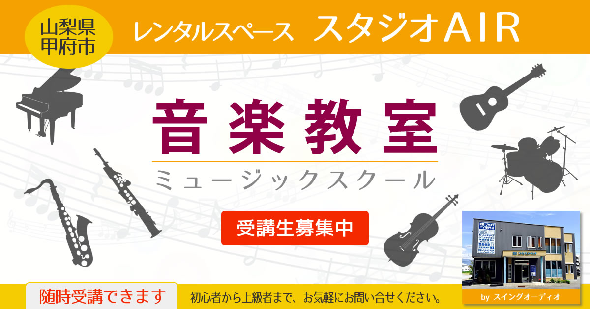 レンタルスペース スタジオAIRは、甲府市南部のアクセスの良い閑静な場所に位置し、48畳という広い防音ルームにグランドピアノやドラムセット、各種アンプやスピーカー、PA機器などを取り揃え、個人練習からパート練習、ビッグバンドの練習まで幅広くお使い頂けます。